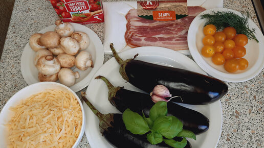 Горячая закуска Баклажаны с беконом, в томатном соусе с грибами и помидорами черри