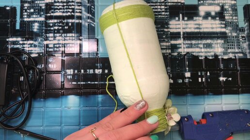 Декор бутылочек из бусинок ,джутовой нити ,пряжи и искусственных цветочков .
