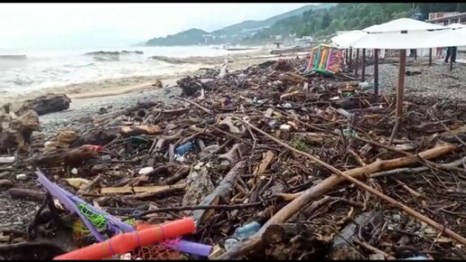 Ураган в Сочи. Пляжи засыпаны бревнами, палками и пластиковыми бутылками