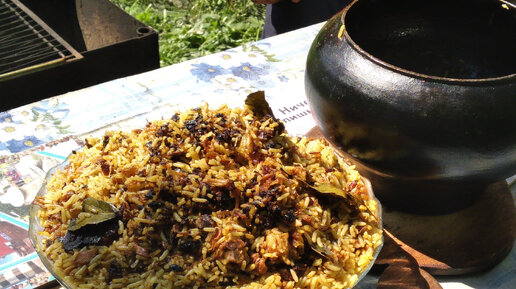 Деревенский плов в чугунке на костре.