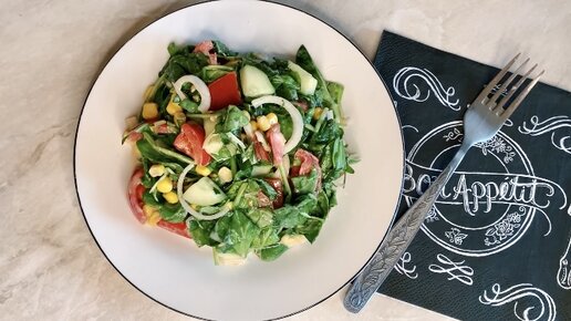 Салат из шпината с огурцами, помидорами и кукурузой.