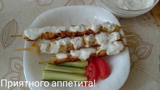 Мясо на шпажках с соусом из сметаны.