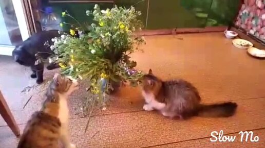 Хозяйка принесла для своих кошек букет цветов. Они были очень рады ему