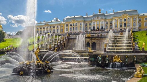 Множество прохладных фонтанов в парках Петергофа спасают туристов от летней жары