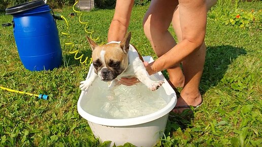Французский бульдог: купаем собаку в жаркую погоду! Собаке нравится!