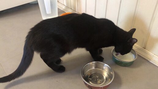 Наш самый чёрный котёнок Черныш снова не ночевал дома, утром прибежал с раной на спине и голодный как волк, кушает и пьёт молоко