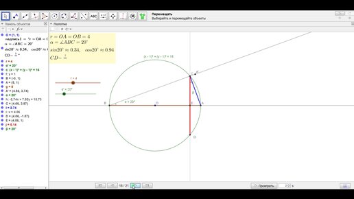 Определить длину хорды CD, перпендикулярной диаметру окружности. Известно, что ∠АВС = 20°, sin20° ≈ 0.34, cos20° ≈ 0.94, r = 4.