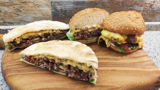 Бургер и пита с мясом и овощами - cытный сбалансированный ужин на столе