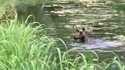 Лось искупался в пруду посреди парка Сокольники в Москве