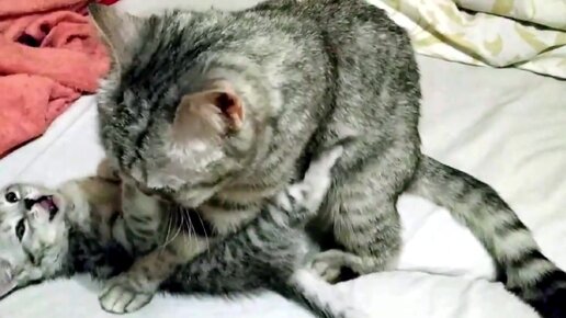 Мама кошка приучает месячного котенка умываться
