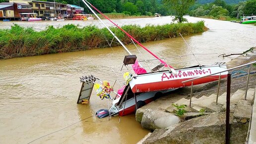 Показываю последствия потопа в Архипо-Осиповке. Машины затопило, катера поломаны, пляж в грязи.
