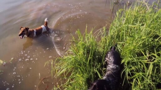 Русский спаниель и гладкошерстный фокстерьер плавают за палкой