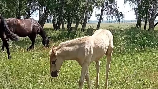 Табун лошадей пришёл попастись возле моего дома. Жеребенок очень любопытный,общаться хочет,так же как и его мама