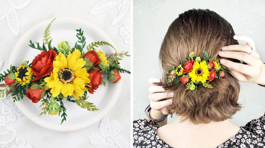 Летняя ЗАКОЛКА с подсолнухами и пионами ИЗ ФОАМИРАНА /Украшения для волос своими руками