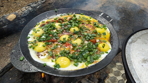 Готовлю сытный завтрак в лесу с копчеными свиными щечками. Получилось ароматное блюдо на большую компанию