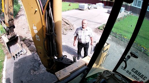 Работа экскаватора-погрузчика CATERPILLAR Выкапываю бардюры.