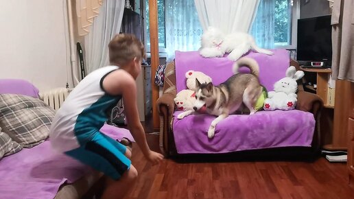 Дима играет с Алисой в мячик. Он кидает, а она шустро бежит за мячом и потом не отдает его
