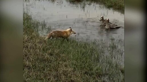 Хитрый лис пытается забрать маленьких гусят, но папа гусь спасает все семейство,