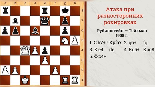 Как атаковать при разносторонних рокировках. Обзор комбинаций из партий - учебное видео №32.1 по шахматной тактике