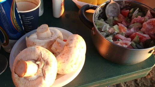 Как готовить просто и вкусно! Жареная картошка с шампиньонами на природе. Овощной салат.