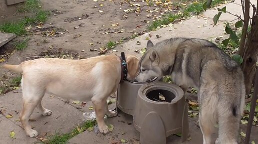 Щенок Хаски играет с лабрадором