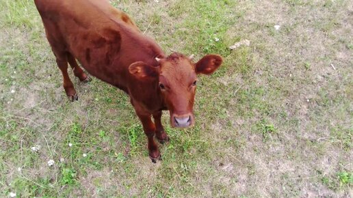 Любопытный теленок смотрит на коптер. Удивительно, что не боится.