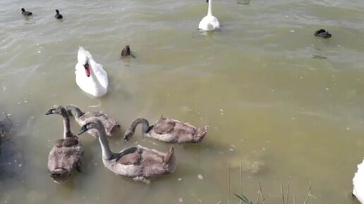 Лебедь-отец охраняет кормление своих лебедят