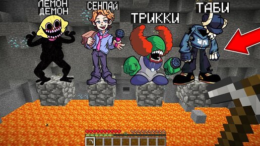 Кого спасти в майнкрафт: Лемон Демон, Сенпай, Трикки или Таби ? FNF MOD