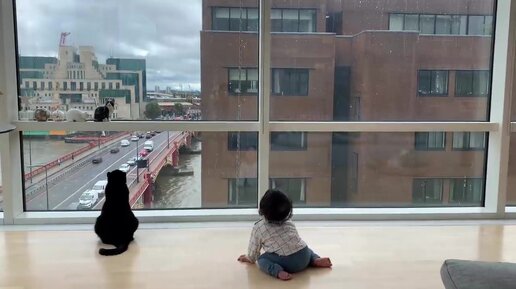 Как ребенок и котики реагируют на высотных мойщиков стекол, забавное зрелище