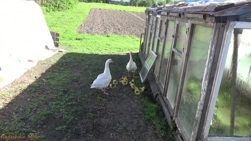 Гусята гуляют на улице. Гошка - папа их воспитывает.