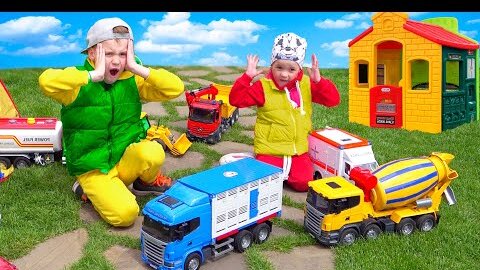 Экскаватор Бетоновоз Трактор и Бензовоз Bruder Веселые истории Про машинки Для Детей