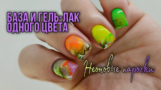 Неоновые базы и гель-лаки одного цвета. Наращивание базой на нижние пластиковые формы. Текстуры на ногтях.