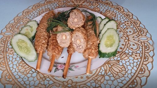 Колбаски из фарша на съедобной палочке.