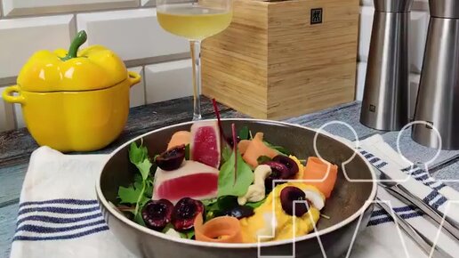 Готовим стейк тунца с кремом из моркови и черешней