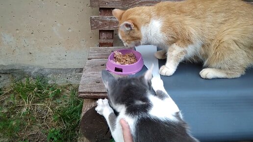 Молодой и юркий котик отбирает у матерого кота еду