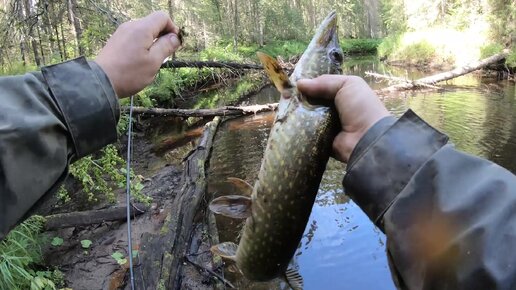 Ловля щуки спиннингом на лесной речке.