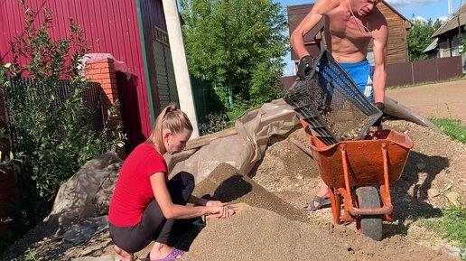 Решили сэкономить, поэтому песок пгс сеем два раза. Помогаю мужу просеять песок