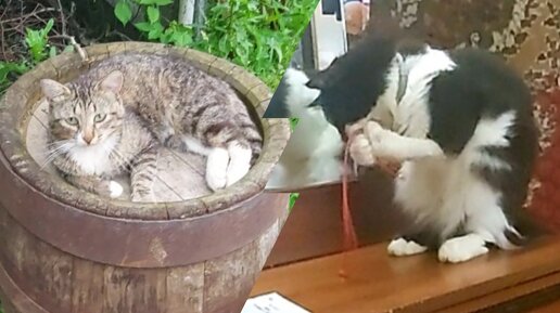 Старшего кота Чувачка бросила любимая кошка Багира. Молодой котик Кузя играет с верёвочкой