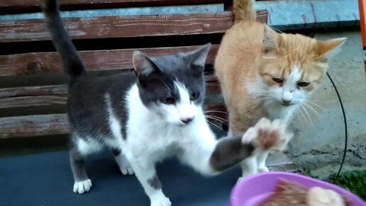 Хотели покормить старого рыжего кота, но молодой и шустрый в наглую таскает еду из миске