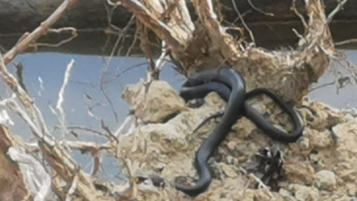 Неожиданное соседство на отдыхе. Недалеко от палаток под берегом оказывается живёт змея. Похоже это чёрная гадюка!