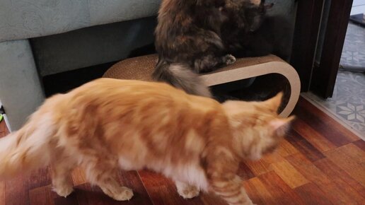 Мейн-куны и их новая игрушка.