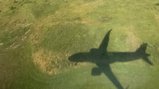 Самолёт заходит на посадку, отбрасывая тень на землю
