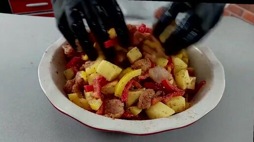 Блюдо из картошки, овощей и куры в духовке.