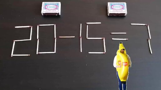 Показываю как решить неверное равенство 20-15=7 Перемести 1 спичку чтобы сделать равенство верным