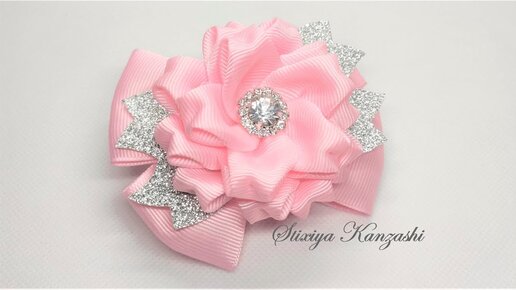 Украшение на заколку Канзаши / Нежные розовые бантики с цветами / Бантики из Эко Кожи и Репса