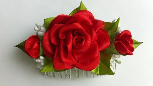 Украшение на гребень Канзаши / Красная Роза с бутонами