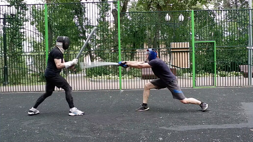 Урок фехтования катаной. Кендзюцу. Спарринг на длинных мечах на улице летом