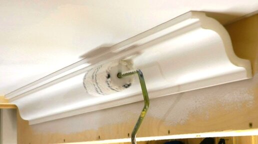 Красим тканевый натяжной потолок, клеим потолочный плинтус, эмитируем затопление, мараем и отмываем
