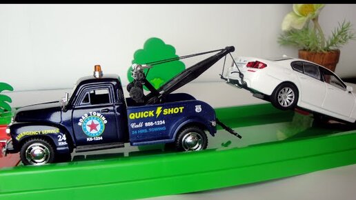 Эвакуатор везет машину БМВ в автомастерскую. Игрушечные машинки