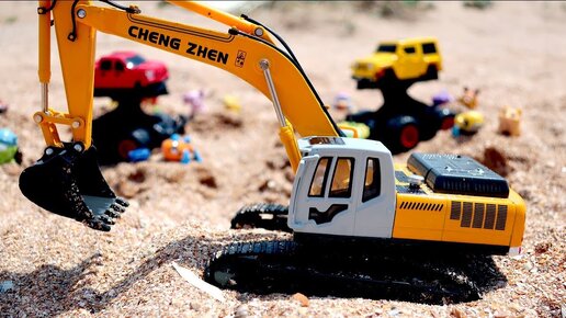 Монстр траки и экскаватор на пляже. Игрушечные машинки. Игры с песком. Ищем сюрпризы